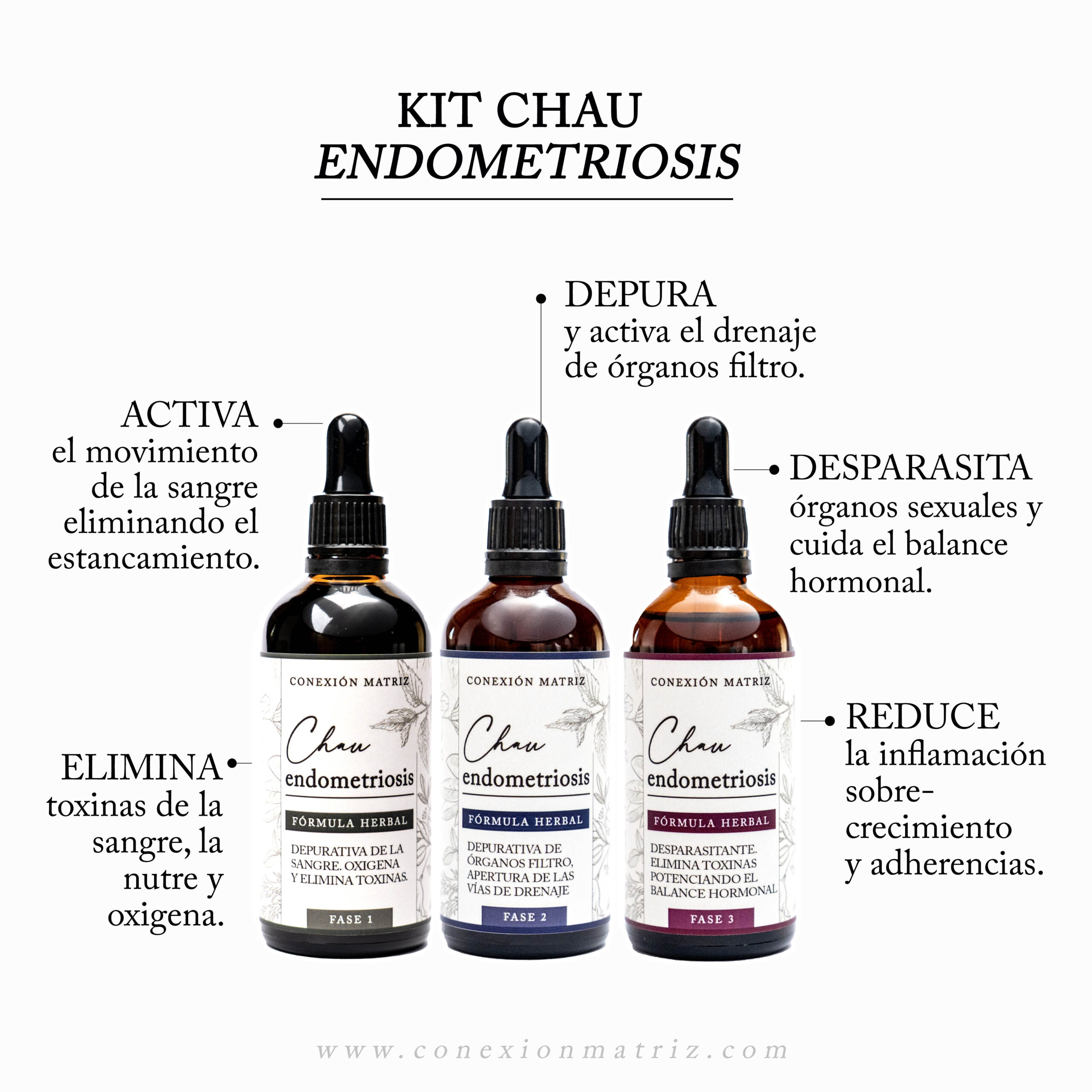Fórmula herbal Chau Endometriosis en 3 etapas. Incluye 3 goteros de 100 cc cada uno (duración aproximada de 3 meses)*. A base de extracto hidroalcohólico de: Urtica, Lippia T, Marrubio V, Artemisa A, Cucurbita P.